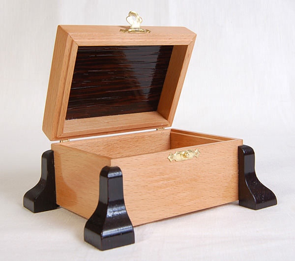 Описание: Шкатулка для драгоценностей выполнена из бука со вставками чёрного дерева, имеет благородный и дорогой вид. Такая шкатулка станет красивым украшением любого дамского столика.