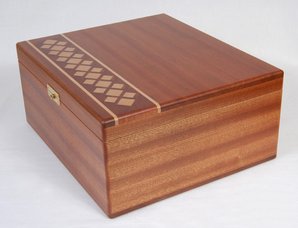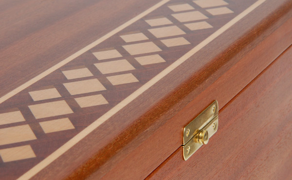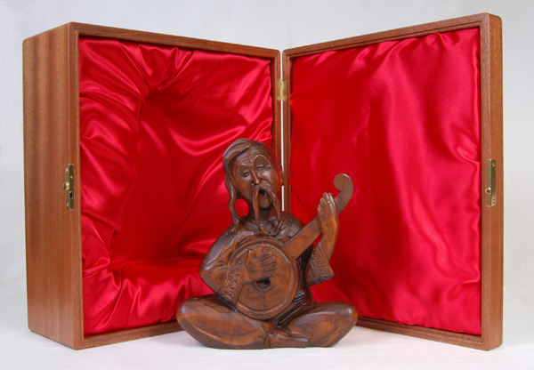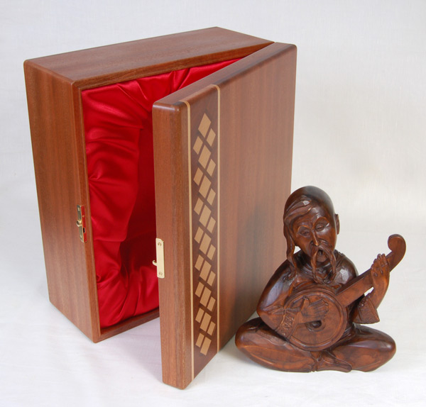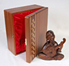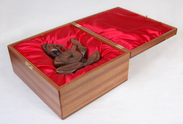 Описание: Коробка для сувенирной статуэтки изготовлена из красного дерева. Мозаика выполнена из торцов сапели и клёна. Также был изготовлен ложемент, который жестко фиксирует положение статуэтки в закрытой коробке.
