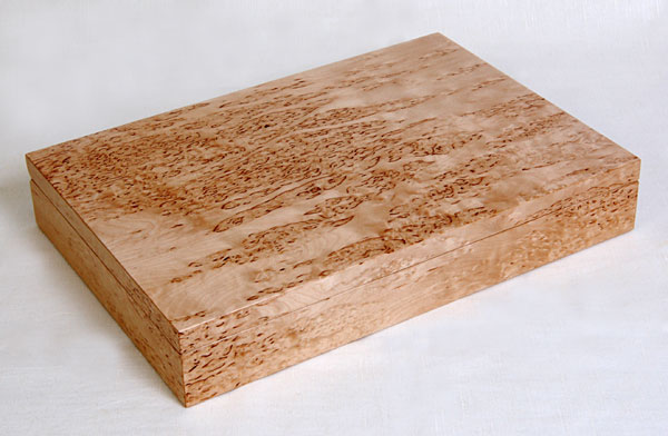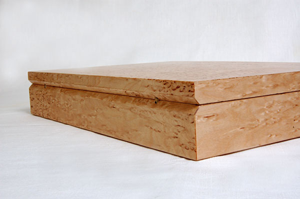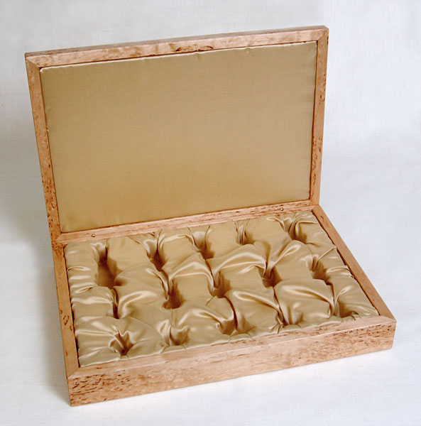 Описание: Данный футляр изготавливался для коллекции нецке (фигурки из слоновой кости). Карельськая берёза дала изделию дорогой и шикарный внешний вид. В качестве замка были вмонтированны магниты.